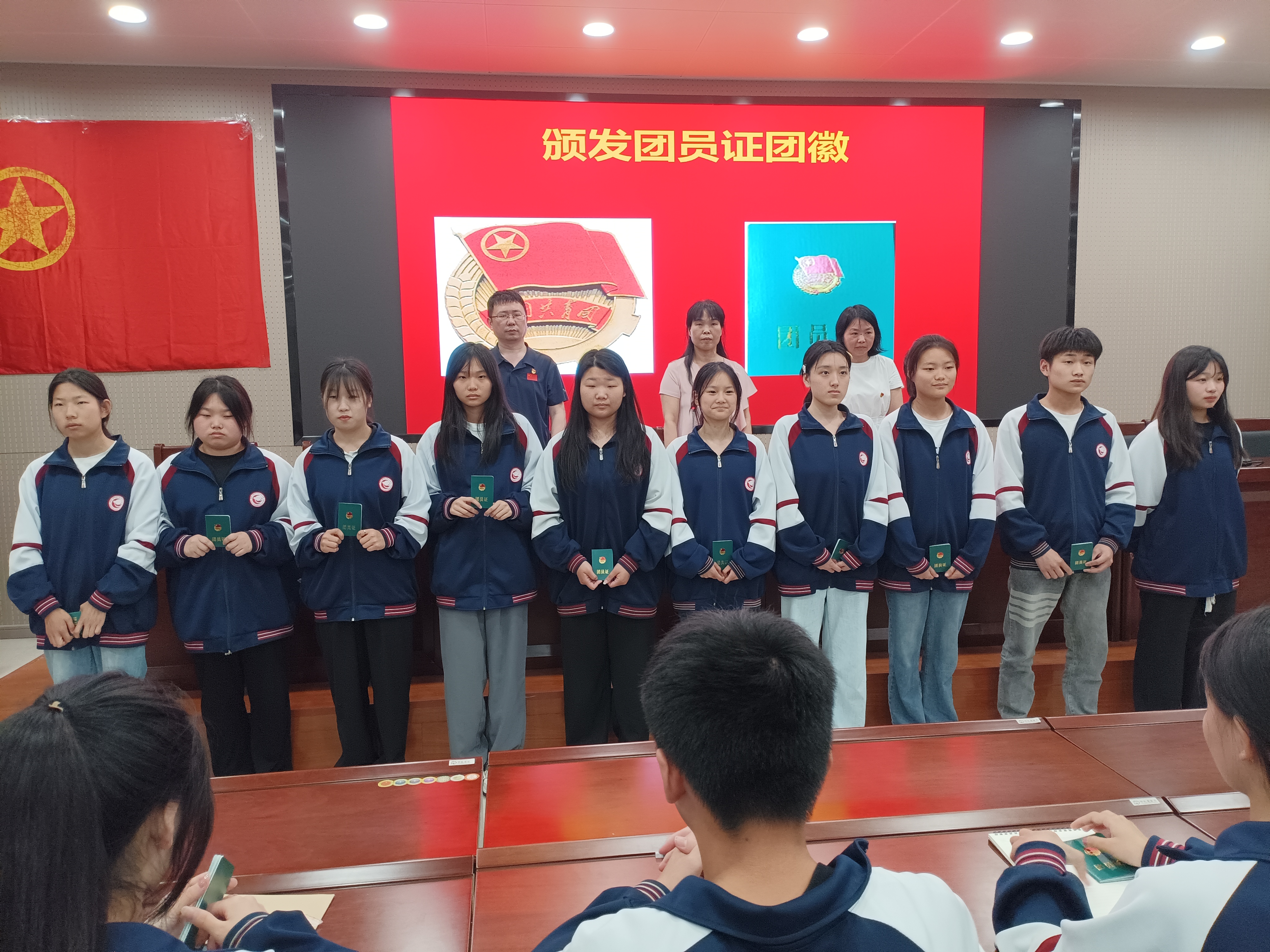 在雄壮的国歌声中,入团宣誓仪式正式开始。郭书记宣读了《关于2023年春期发展新团员的决定》,段书记为方潇潇等50名新团员颁发团徽、团章及团证,团学会周凯学同学带领新团员们面对鲜艳的团旗进行了郑重的入团宣誓。入团介绍人代表郭英同志宣读了《团章》中有关团员的义务和权利的条款,新团员代表和老团员代表也依次进行了发言并表达了在以后工作充分发挥团员模范带头作用,践行“请党放心、强国有我”的青春誓言。