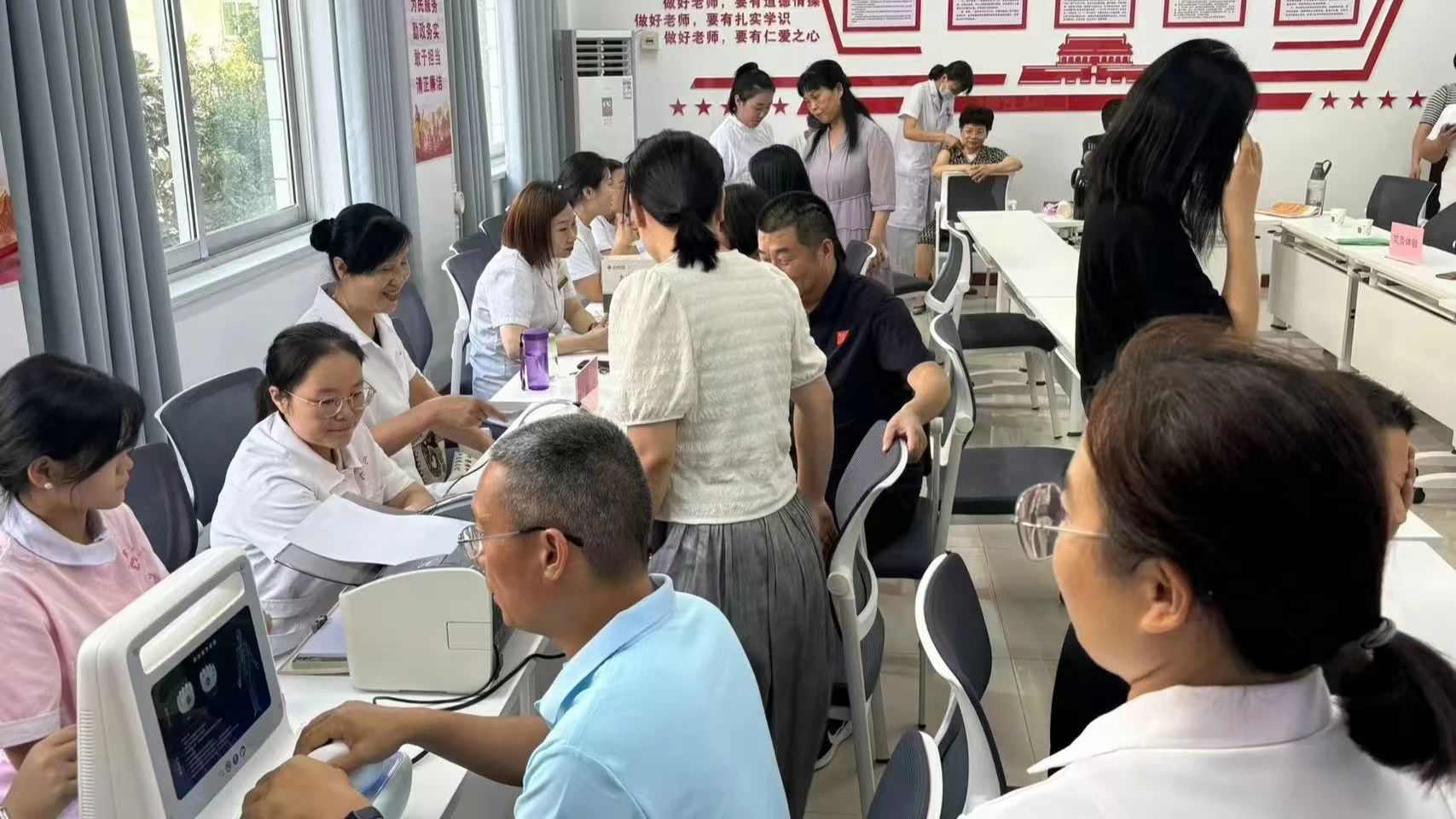 南阳市中医院的专家们不仅认真为教职工把脉、面诊、刮痧、针灸等,还根据教师长期站立教学、伏案备课、批改作业,普遍存在慢性咽喉炎、静脉曲张、颈肩腰腿痛等健康问题,指导大家正确认识自己的体质,并结合日常生活习惯,介绍相应的中医调理和预防保健养生知识,提醒教师们在平时的工作中注意排解自身压力,帮助教师们养成健康的生活方式。对老师们提出的问题,专家们耐心答疑解惑,让大家不出门就享受到了贴心的中医问诊服务。中医专家们认真负责的态度和精湛的医术也得到了大家的一致好评和高度认可,现场热烈有序。