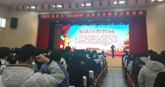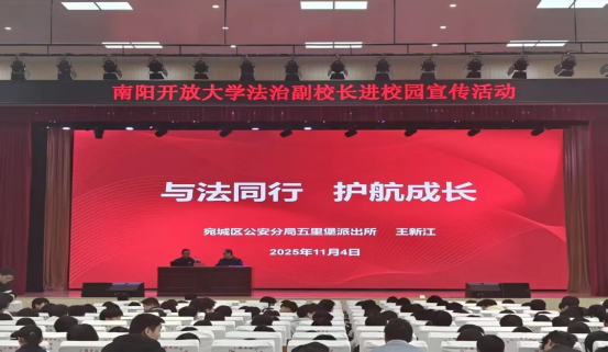 加强校园法治文化建设。开展了2025年网络安全宣传教育,学习《网络安全法》,《个人信息保护法》《中华人民共和国范电信网络诈骗法》。邀请卧龙岗派出所副所长来学校开展法治安全教育,围绕防范电信诈骗和杜绝校园欺凌两大主题,对学生进行法治教育,防范电信诈骗,杜绝校园欺凌,维护校园安全。举办了“与法同行,护航成长”活动,邀请法制副校长为全校师生带来了一场生动深刻的法治宣讲活动。11月宛城区法院到南阳开放大学开展巡回审判暨送法进校园活动;宪法日开展了“弘扬宪法精神 护航青春成长”——南阳市司法局开展“宪法进校园”法治宣传教育主题活动,弘扬了宪法精神,增强了学生的法治意识,养成学法、知法、懂法、用法、护法的法治思维习惯,校园秩序为之焕然一新。