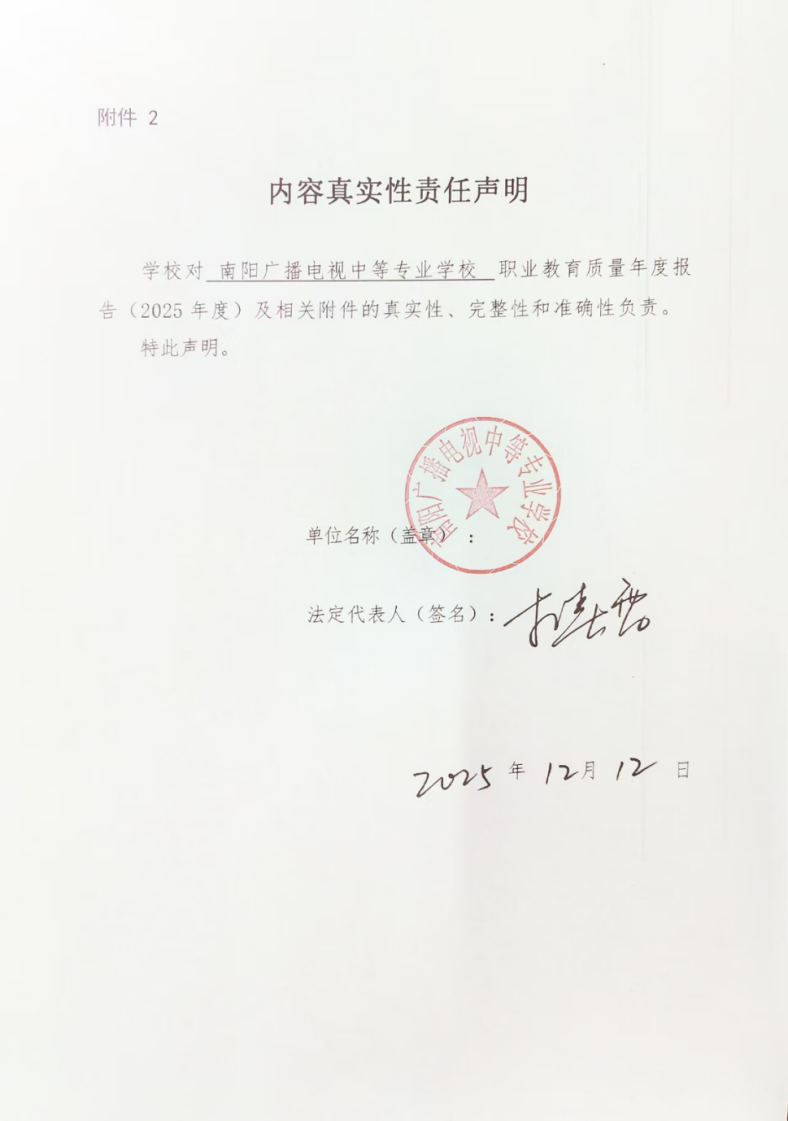 为贯彻全国职业教育大会精神,落实《国家职业教育改革实施方案》,根据南阳市教育局《关于做好职业教育质量年报(2025年度)编制、发布和报送工作的通知》要求,结合学校2025年整体工作实际,在充分调研和认真提炼的基础上编写本次年报,力求全面真实反映学校2025年办学质量全貌。年报主体紧扣人才培养主题,围绕党建引领、德育思政、教育教学、产教融合、师资建设、项目申报、特色品牌、服务贡献、发展保障、面临挑战等10个方面,全面总结学校中专教育高质量发展情况,部分内容附有图片、数据分析图或数据分析表,以便更直观地反映发展情况。主体部分后另附有人才培养质量计分卡、满意度调查表、教学资源表、服务贡献表、落实政策表等6个附件。现将学校2025年度质量报告编制如下。