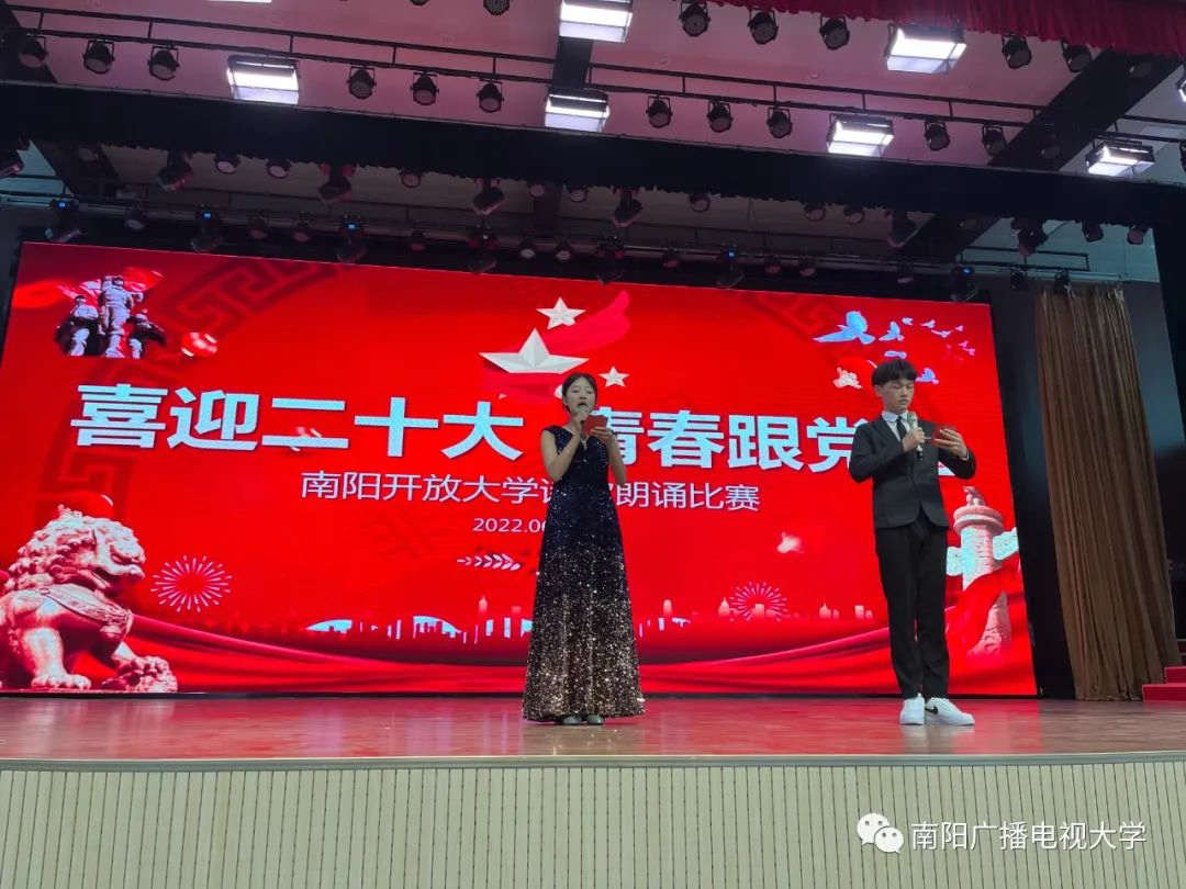 为喜迎中国共产党二十大胜利召开,激发青年学生爱国热情,南阳开放大学于6月7日下午在学校大礼堂举办“喜迎二十大,青春跟党走”诗歌朗诵比赛。