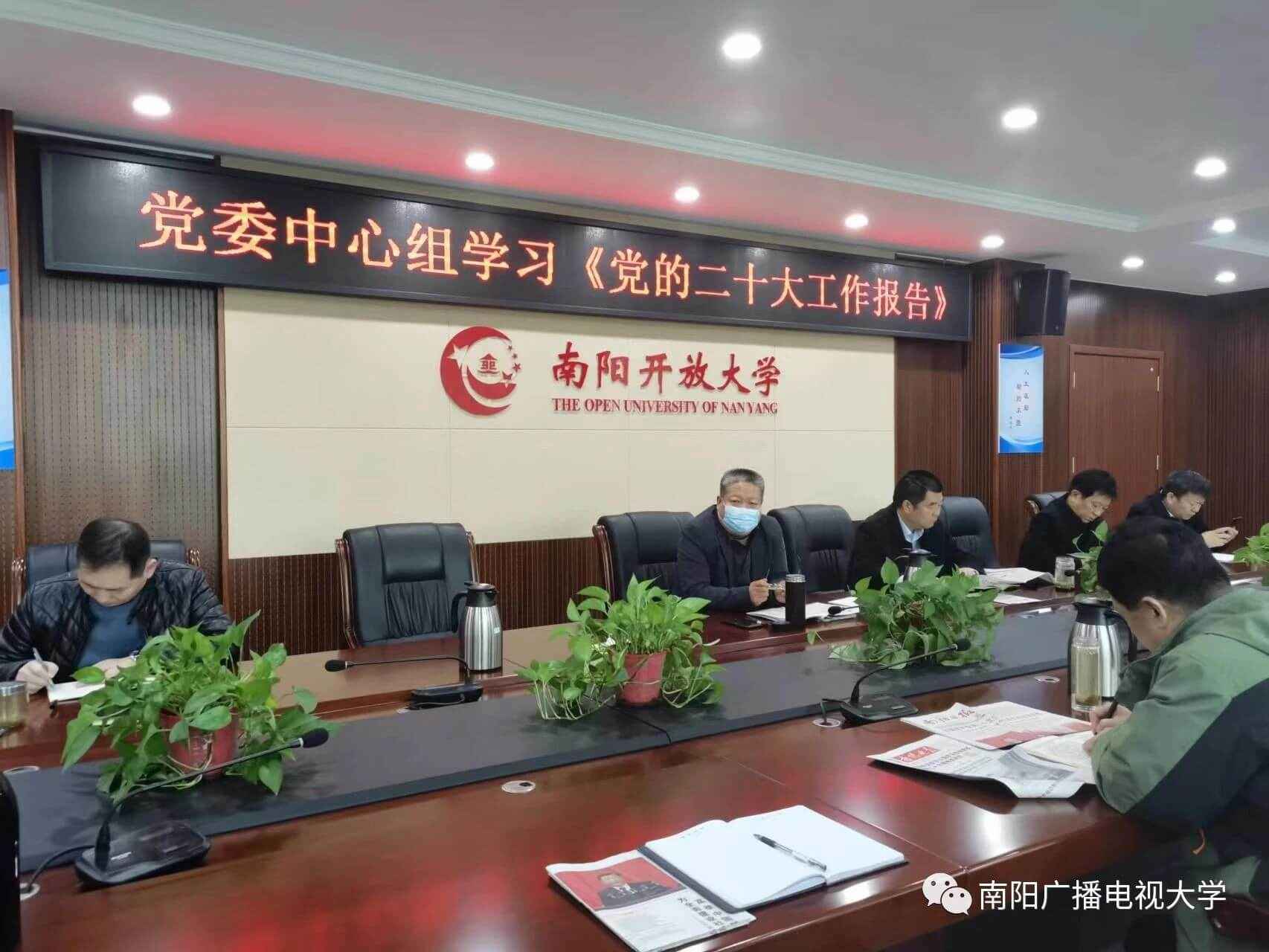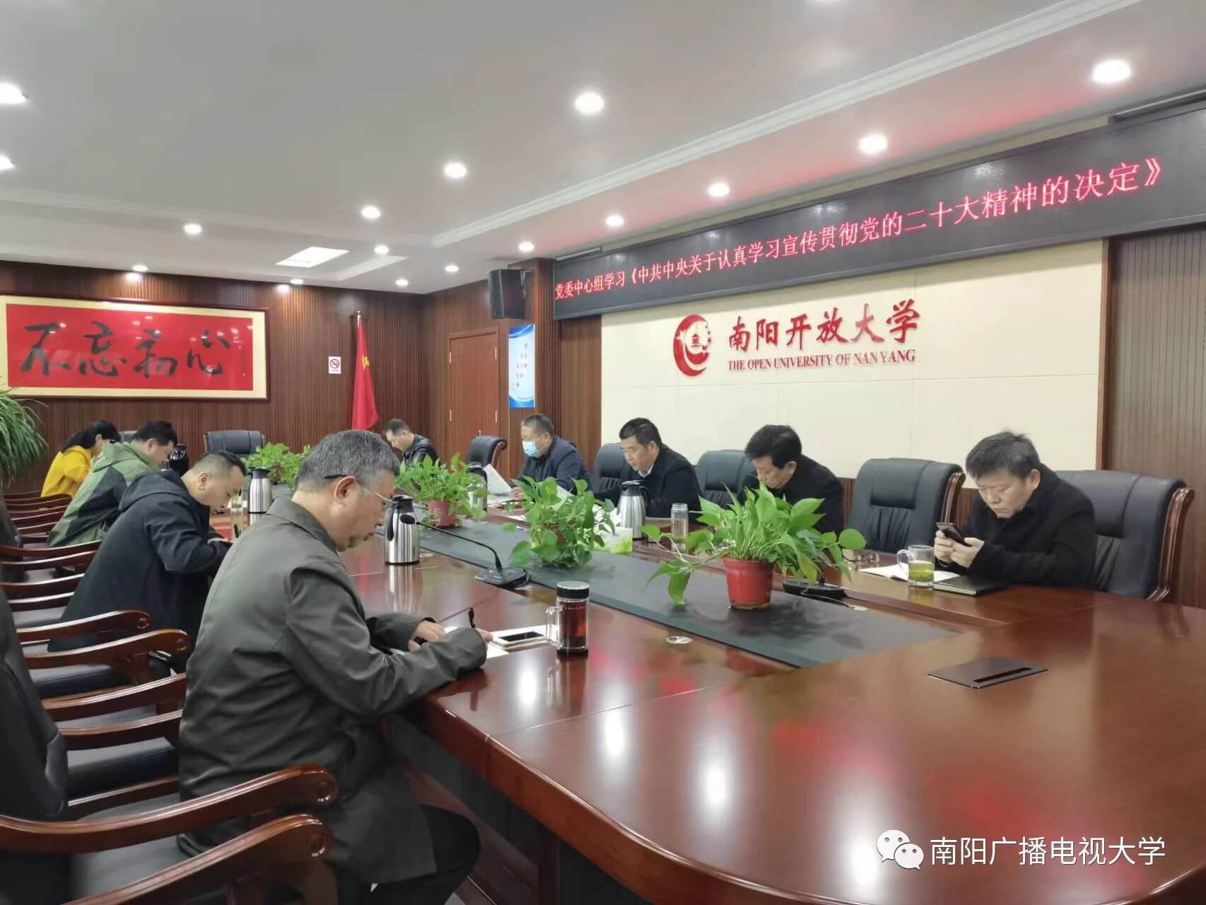 11月22日上午,南阳开放大学在综合楼二楼会议室召开党委理论学习中心组学习会,传达学习中共中央关于认真学习宣传贯彻党的二十大精神的决定和党的二十大工作报告。党委理论学习中心组成员、各支部书记参加会议。党委书记全廷建主持会议。