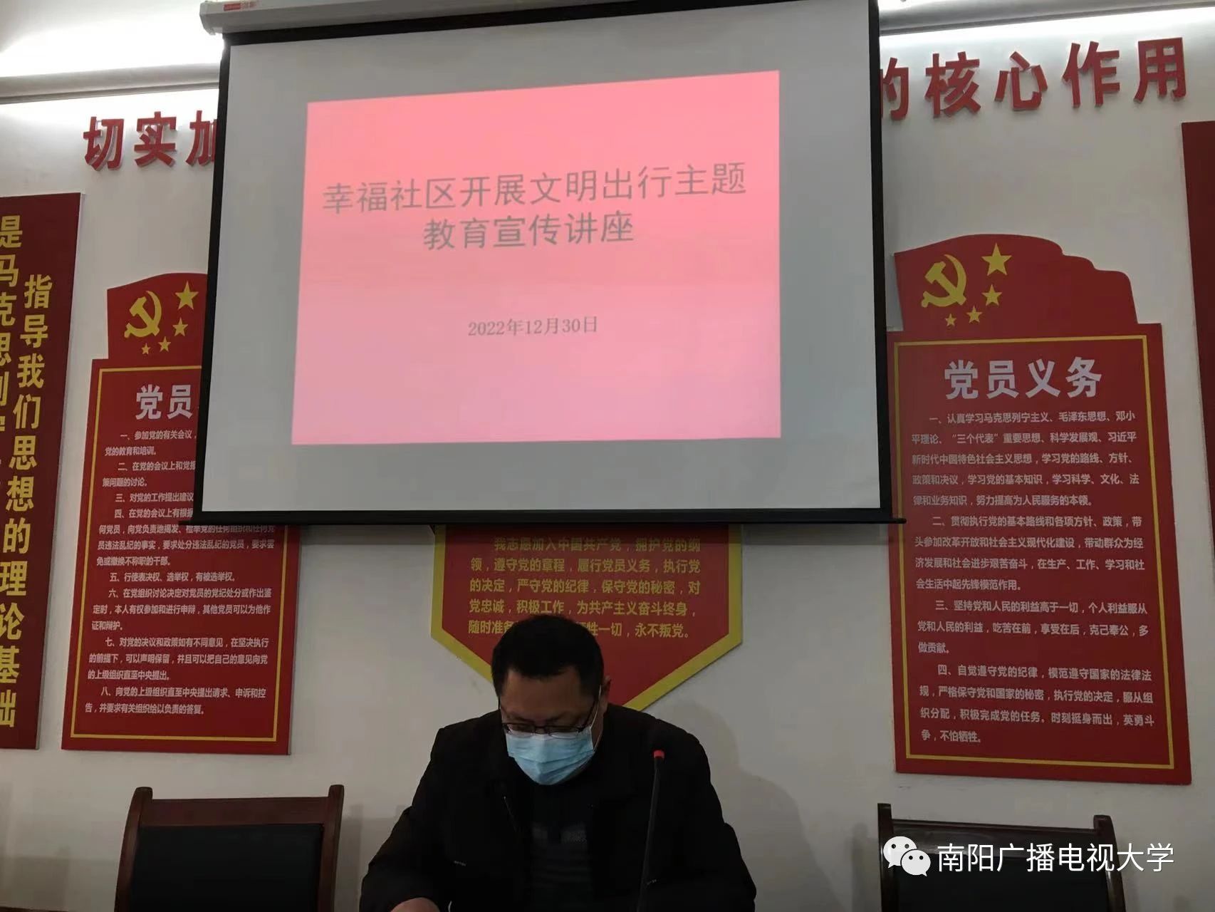 为进一步增强干部职工遵守交通法规的自觉性,有效提高交通安全意识和自我防范能力,12月30日,南阳开放大学联合幸福社区开展文明出行主题教育宣讲活动。此次活动由我校保卫处处长蒋贵全主讲,我校志愿者和社区居民共计30余人参加。