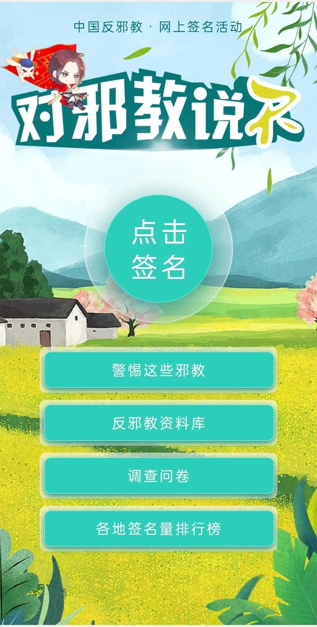 邪教危害国家政治经济稳定,破坏社会治安,危害公共秩序,毒化社会风气。为防止邪教组织向校园渗透,坚决守好校园意识形态阵地,保障学校师生思想健康向善,4月13日下午中专处组织全体同学开展“向邪教说不~网上签名活动”。活动中,各位班主任老师第一时间将通知转发至班级学生群、家长群,要求全体同学认真参与,提醒家长及时参与,同学们积极参与完成并进行了反馈。