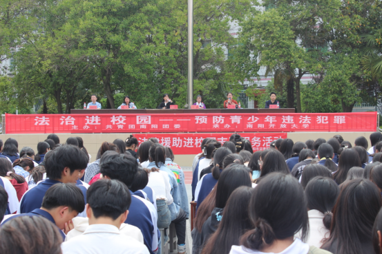 为使我校中专学生进一步增强法治意识,养成遵纪守法的良好习惯,学会利用法律进行自我保护,做一个知法、懂法、守法的合格中职生,5月11日下午,南阳市法律援助中心科长梁蕾、河南梅溪律师事务所专职律师樊垚、李颂一行三人到我校开展《预防青少年违法犯罪、拒绝校园欺凌》法治宣讲。本次宣讲会在学校操场举行,校团委书记、中专教育部主任段志东,中专教育部副主任郭英,校团委副书记郭永利,全体班主任及学生参与活动。