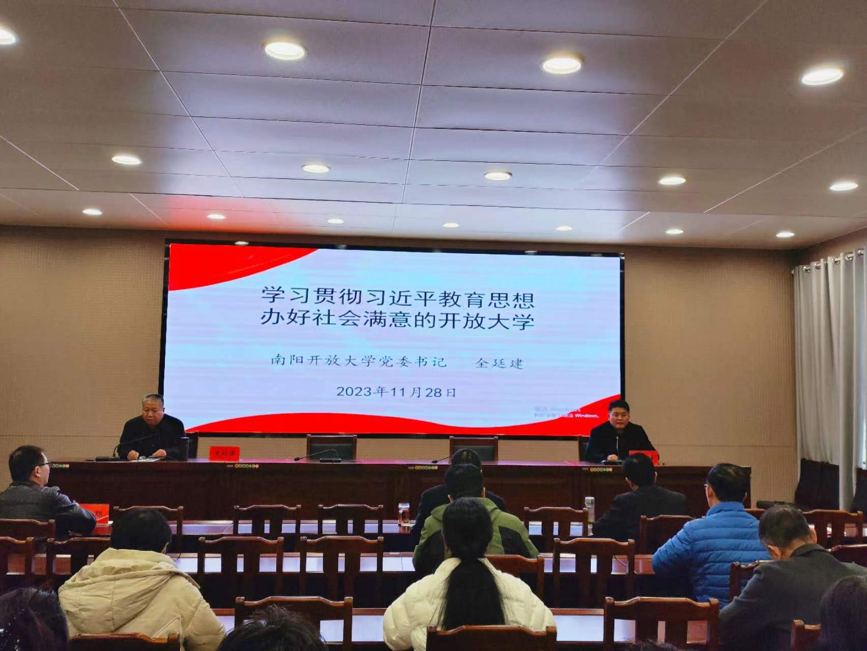 为深入学习习近平总书记关于教育问题重要论述,扎实推进学习贯彻习近平新时代中国特色社会主义思想主题教育,11月28日下午,我校开展《学习贯彻习近平教育思想,办好社会满意的开放大学》主题党课。此次党课由党委书记全廷建主讲,党委副书记房保峰主持,其他班子成员出席活动。