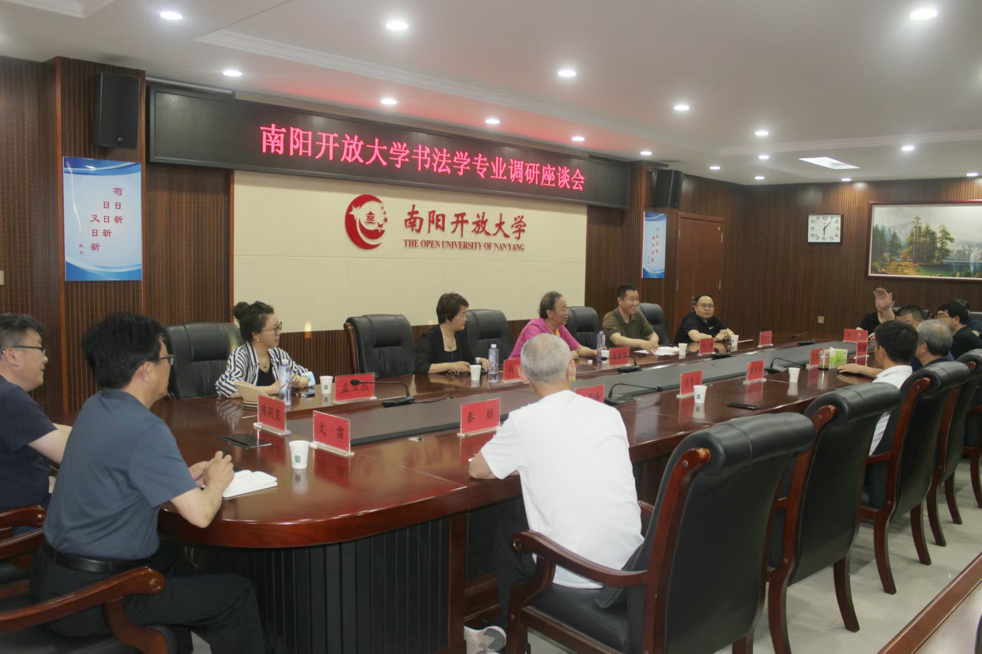 5月23日下午,国家开放大学特聘教授庞中华先生、国家开放大学艺术学院院长助理牛涛、河南开放大学人文与设计学院院长尚宏一行到南阳开放大学调研,校党委副书记、校长李春雷及其他班子成员参与调研。河南省书法家协会副主席、南阳市书法家协会主席张青山和我市书法专家参加了座谈。