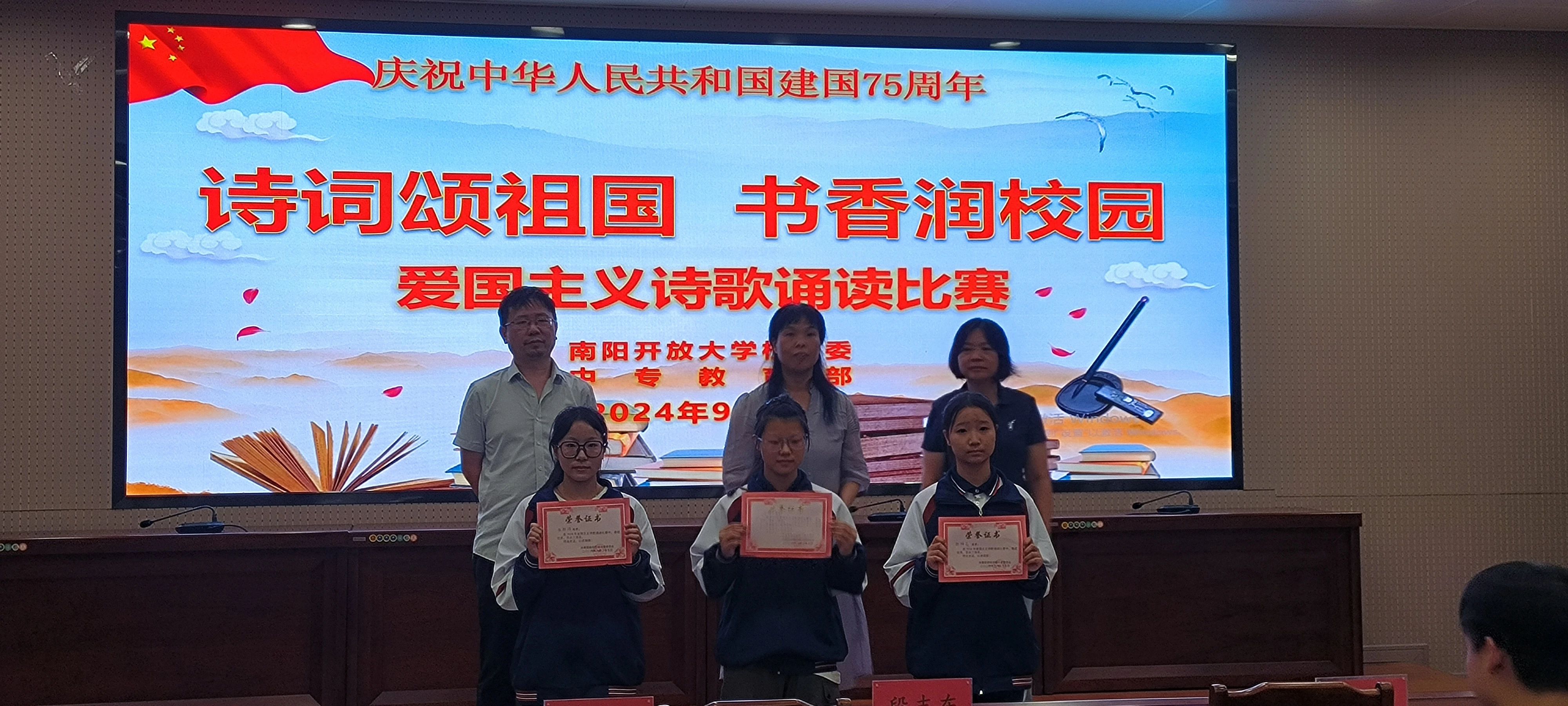 南阳开放大学中专教育部成功举办了以“诗词颂祖国 书香润校园”为主题的爱国主义诗歌诵读比赛。