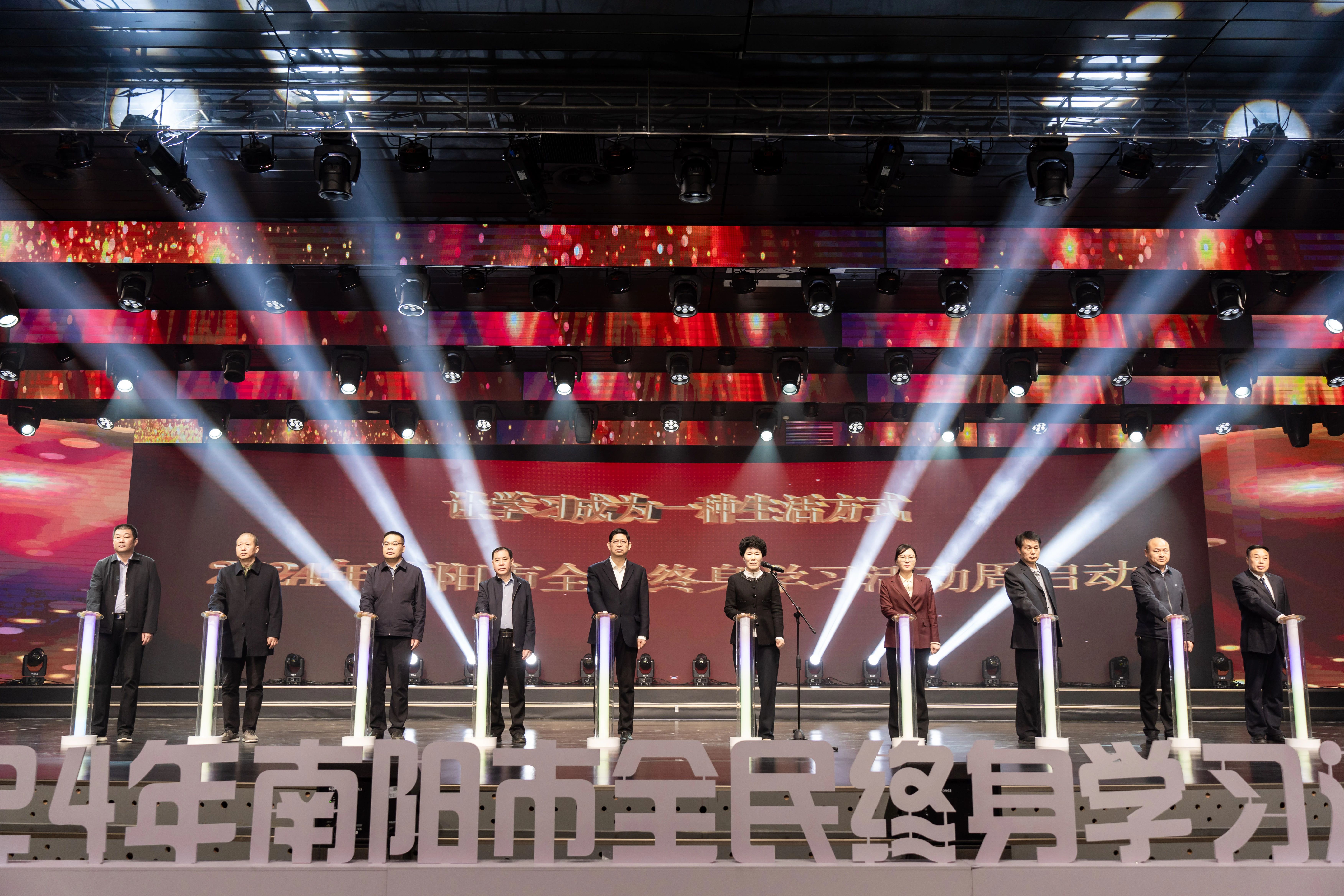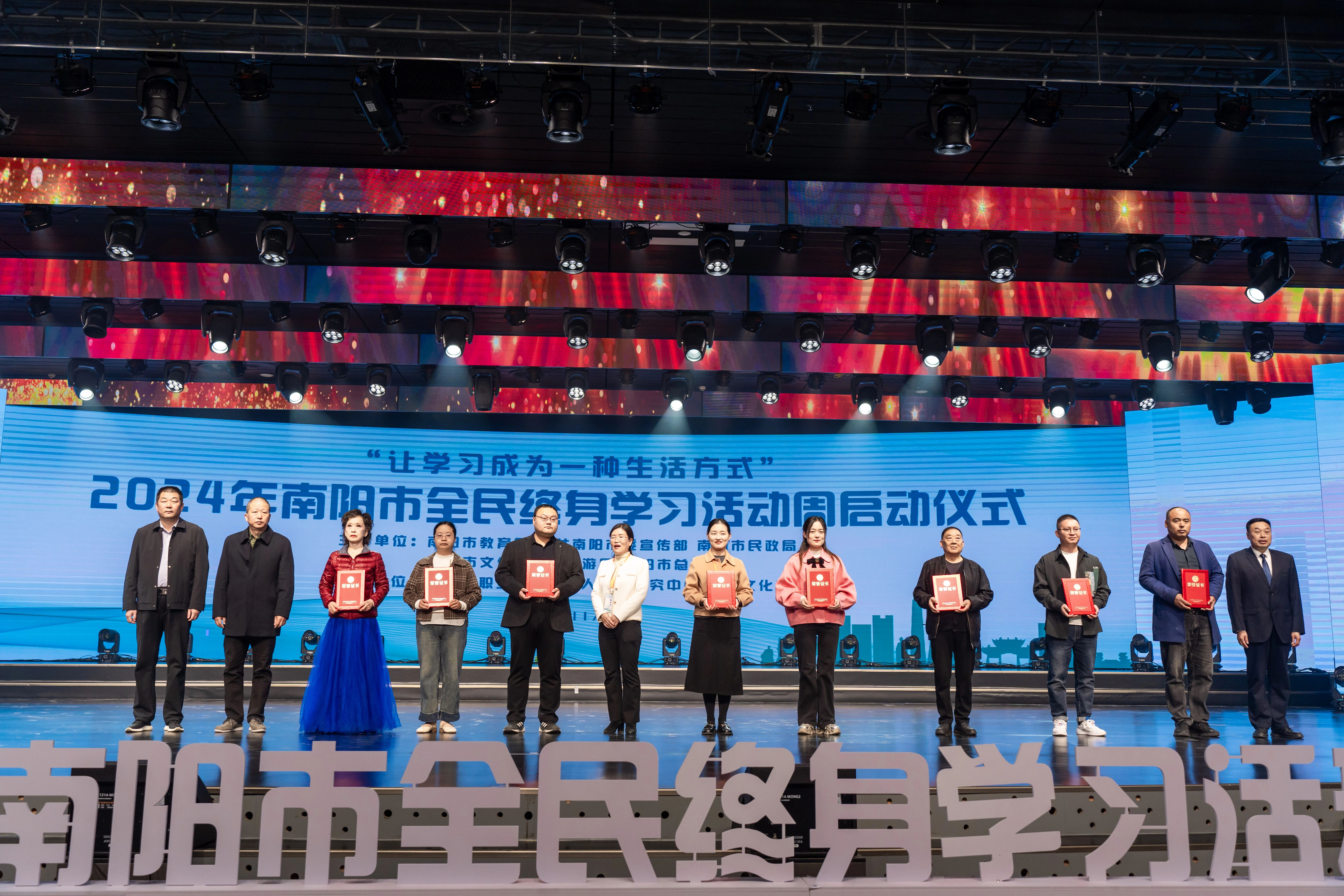 在颁奖现场,校长李春雷作为颁奖领导为2024年南阳市“百姓学习之星”,“终身教育学习品牌项目”获奖个人和单位颁奖,与会领导现场启动2024年全民终身活动周启动立柱。