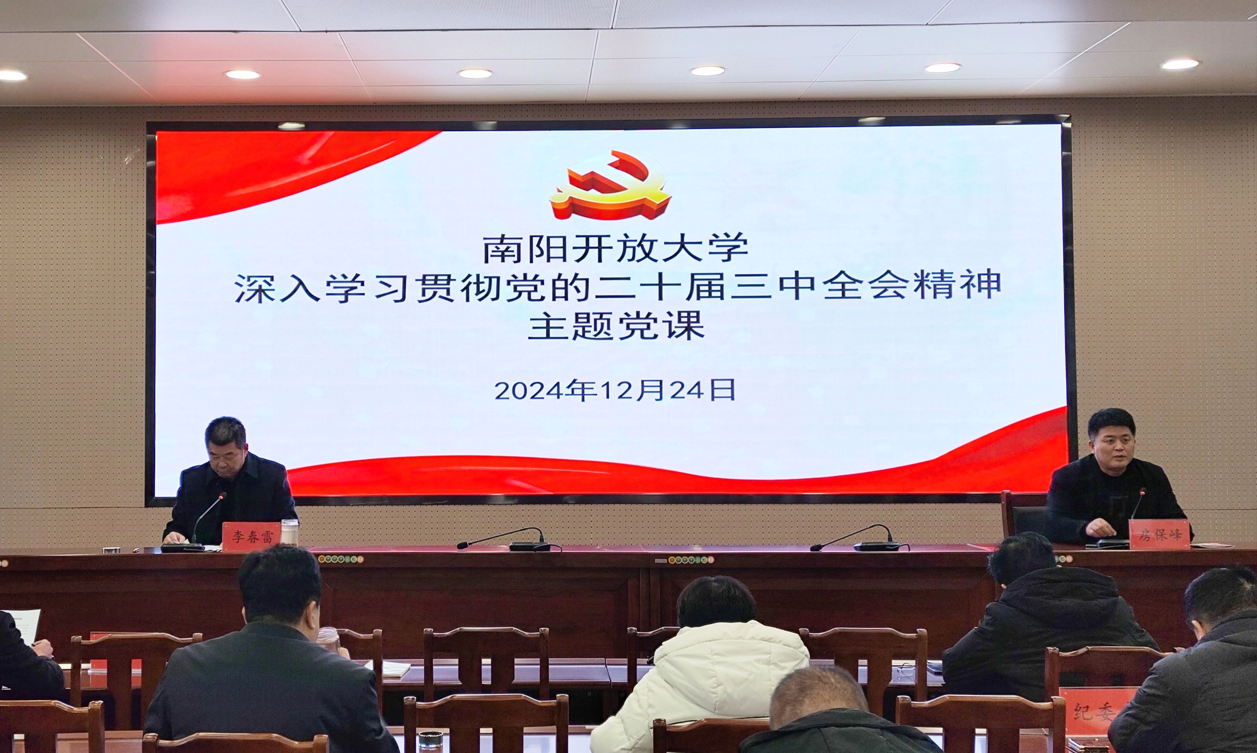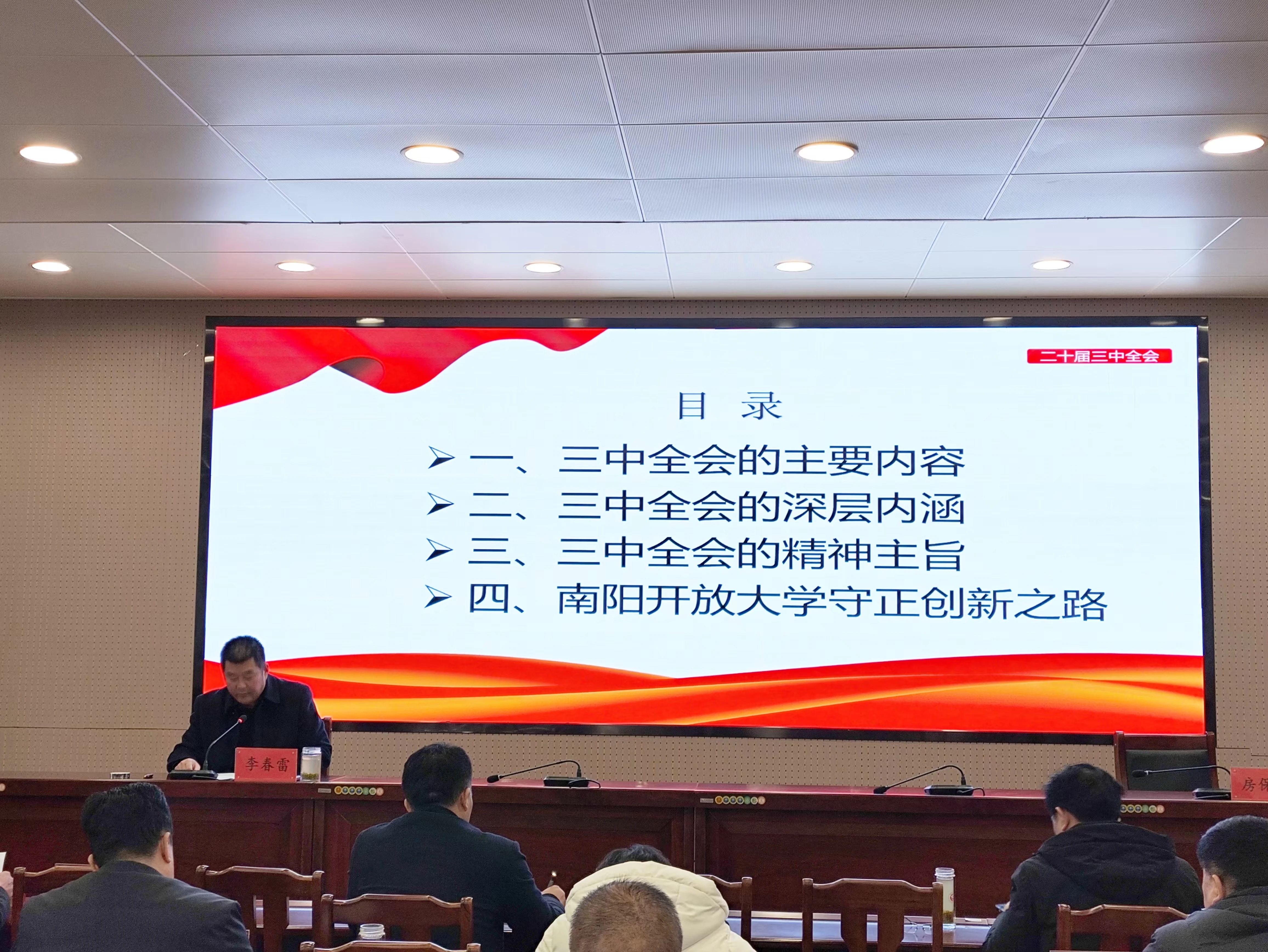 为深入学习贯彻党的二十届三中全会精神,12月24日下午,南阳开放大学党委副书记、校长李春雷为全体教职工讲了一次题为《深入学习贯彻党的二十届三中全会精神、守正创新推动南阳开放大学高质量发展》的主题党课,校党委副书记房保峰主持活动。