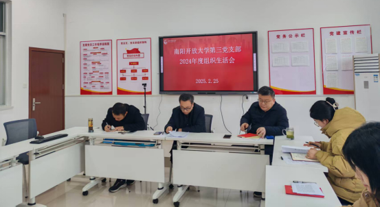 为深入学习贯彻习近平新时代中国特色社会主义思想和党的二十大及二十届二中、三中全会精神,纵深推进全面从严治党,巩固深化党纪学习教育成果,综合发挥党的纪律教育约束、保障激励作用,提升党员的凝聚力和战斗力,南阳开放大学各支部以党员大会形式于2月25日召开了2024年度组织生活会。