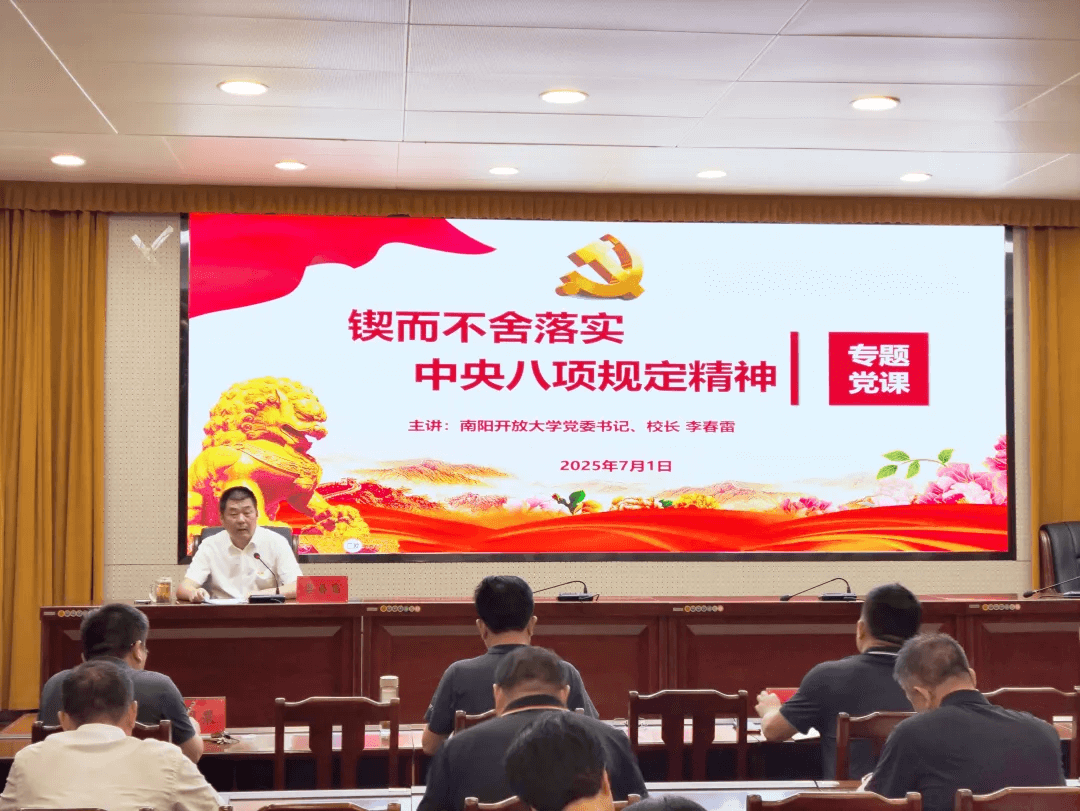 为推进深入贯彻中央八项规定精神学习教育走深走实,持续巩固拓展作风建设成果,7月1日下午,南阳开放大学党委书记、校长李春雷以“锲而不舍落实中央八项规定精神”为题,为全体教职工讲授深入贯彻中央八项规定精神学习教育专题党课。
