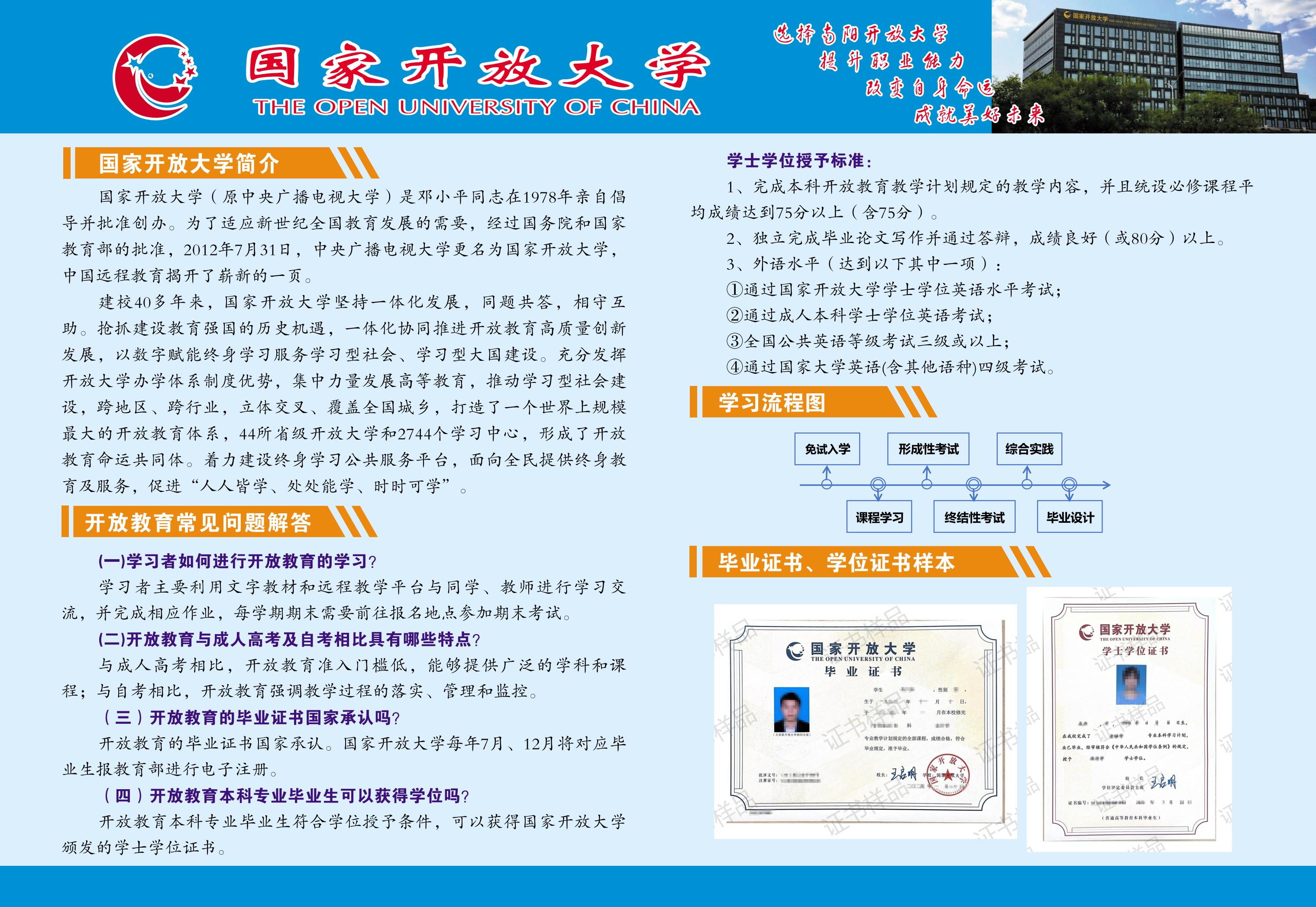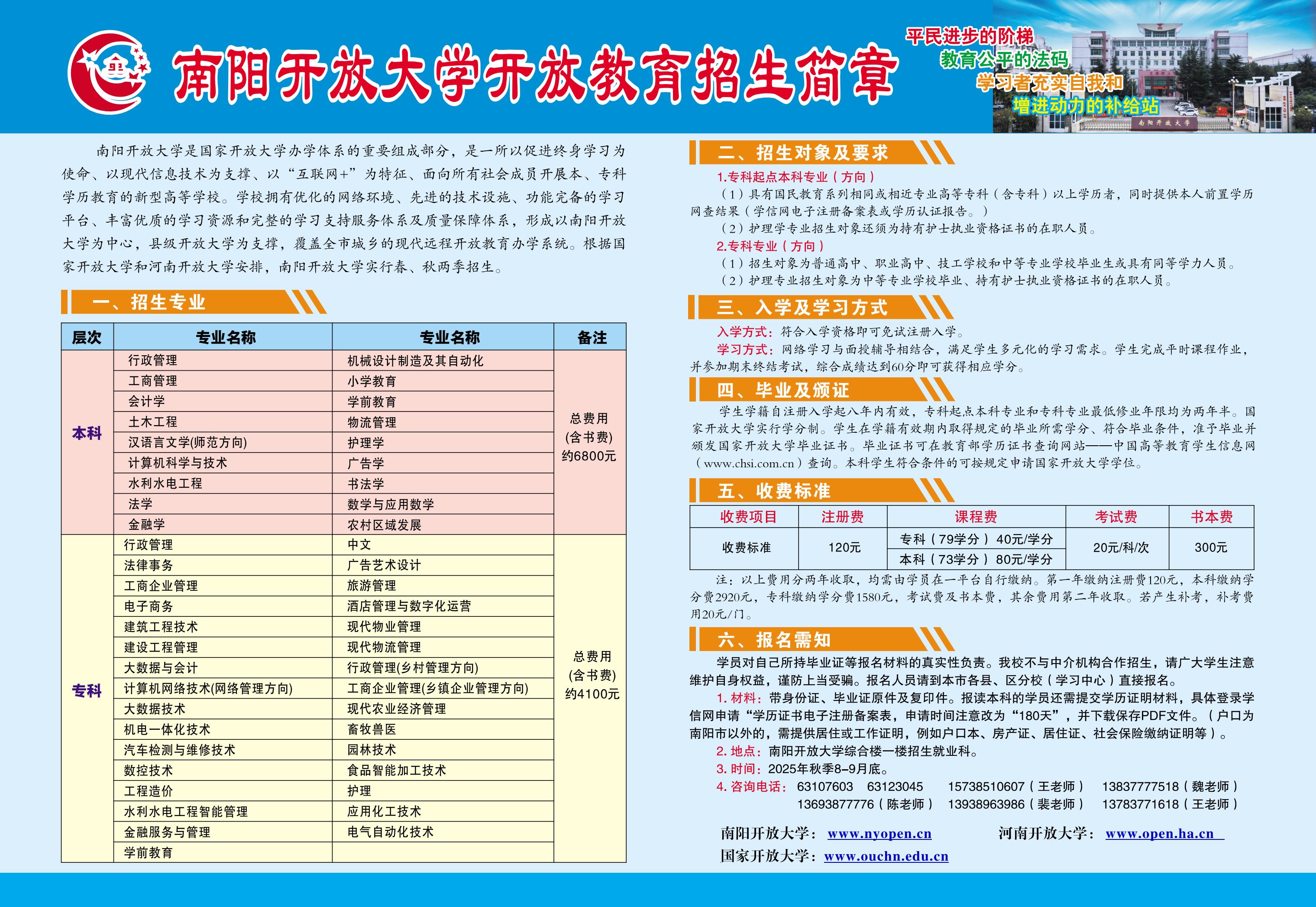 南阳开放大学是国家开放大学办学体系的重要组成部分,是一所以促进终身学习为使命、以现代信息技术为支撑、以“互联网+”为特征、面向所有社会成员开展本、专科学历教育的新型高等学校。学校拥有优化的网络环境、先进的技术设施、功能完备的学习平台、丰富优质的学习资源和完整的学习支持服务体系及质量保障体系,形成以南阳开放大学为中心,县级电大(学习中心)为支撑,覆盖全市城乡的现代远程开放教育办学系统。根据国家开放大学和河南开放大学安排,南阳开放大学实行春、秋两季招生。