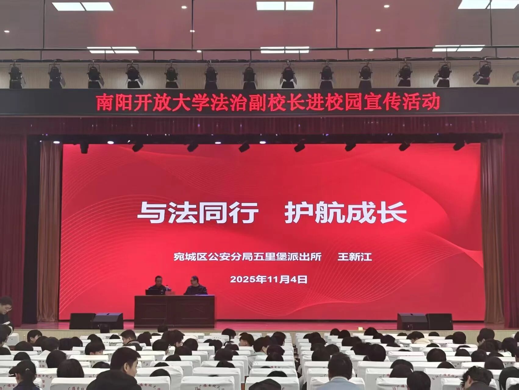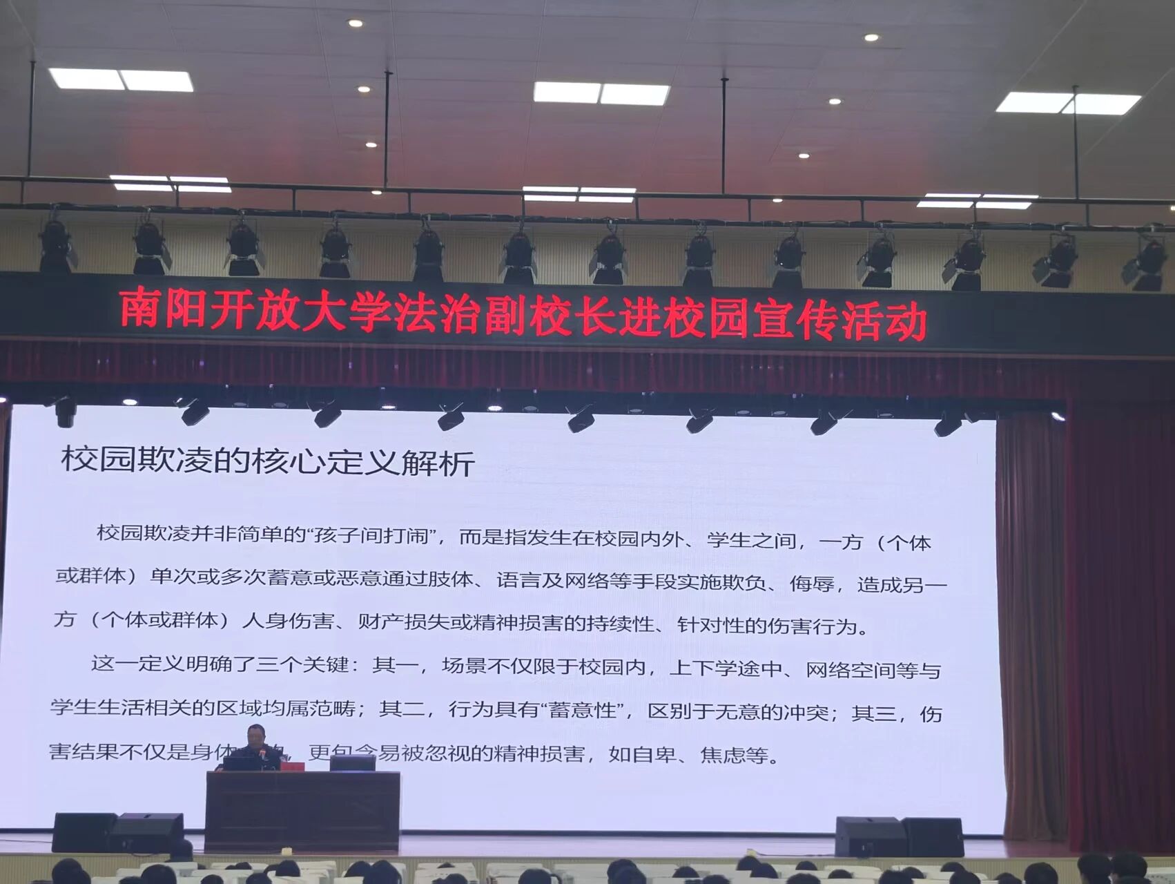 为进一步增强未成年人法治观念,提高学生识别校园欺凌及自我保护的能力,11月4日,五里堡派出所民警王新江以法治副校长的身份走进南阳开放大学,以“与法同行 护航成长”为主题,为全校师生带来了一场生动深刻的法治宣讲。