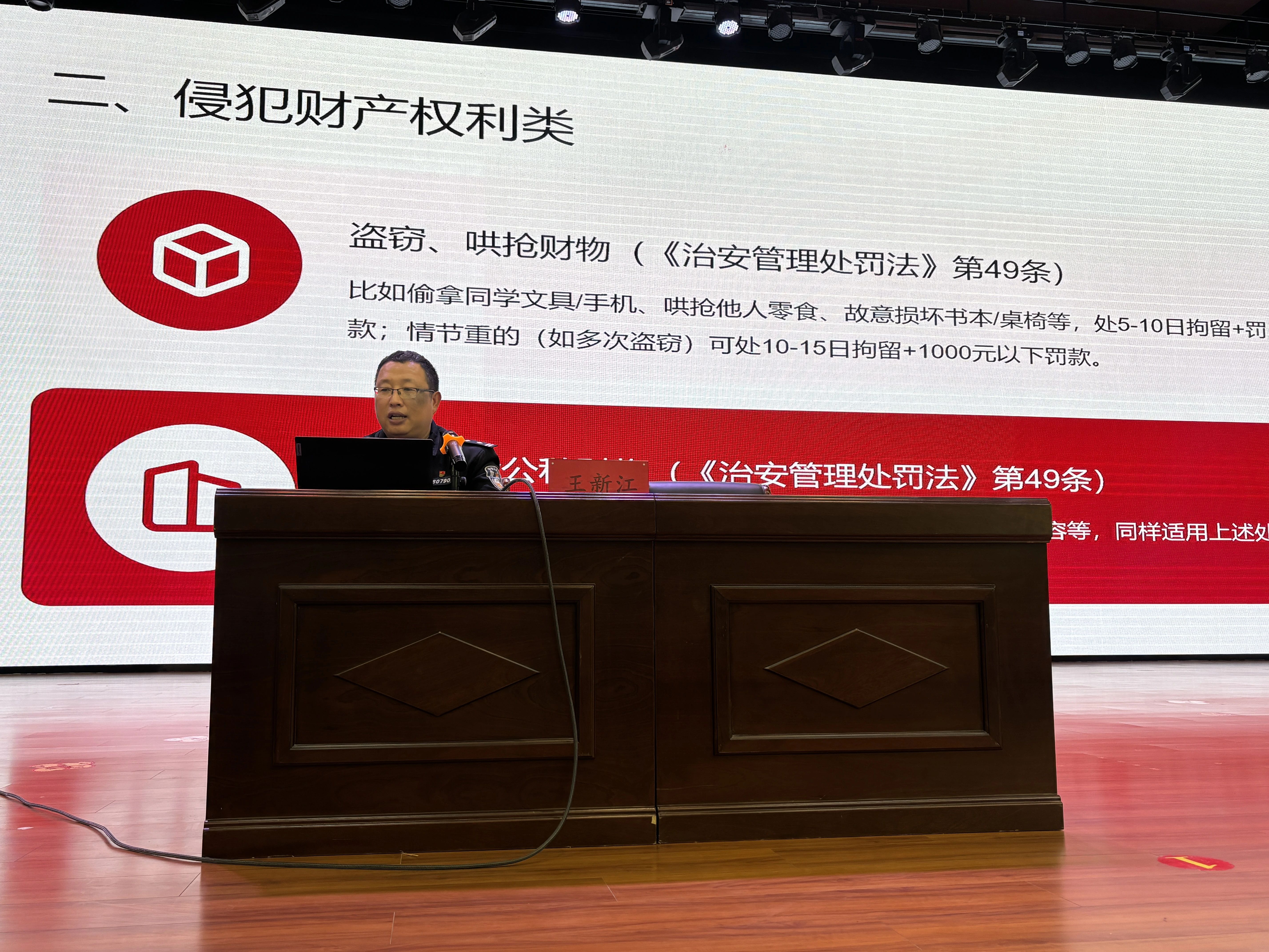 在学生常见治安违法行为讲解环节,王警官用“家常话”解读法律条文,梳理出三类高频风险点:一是侵犯人身权利类,比如校园内殴打同学、强拿硬要财物等校园欺凌行为;二是侵犯财产权利类,像盗窃、哄抢财物、故意损毁公私财物等;三是扰乱公共秩序类,如在课堂起哄闹事,校园内寻衅滋事等。他通过“案例对比”阐释新法亮点,明确对不予处罚的未成年人将采取矫治教育措施,体现“教育与惩戒结合”原则 。