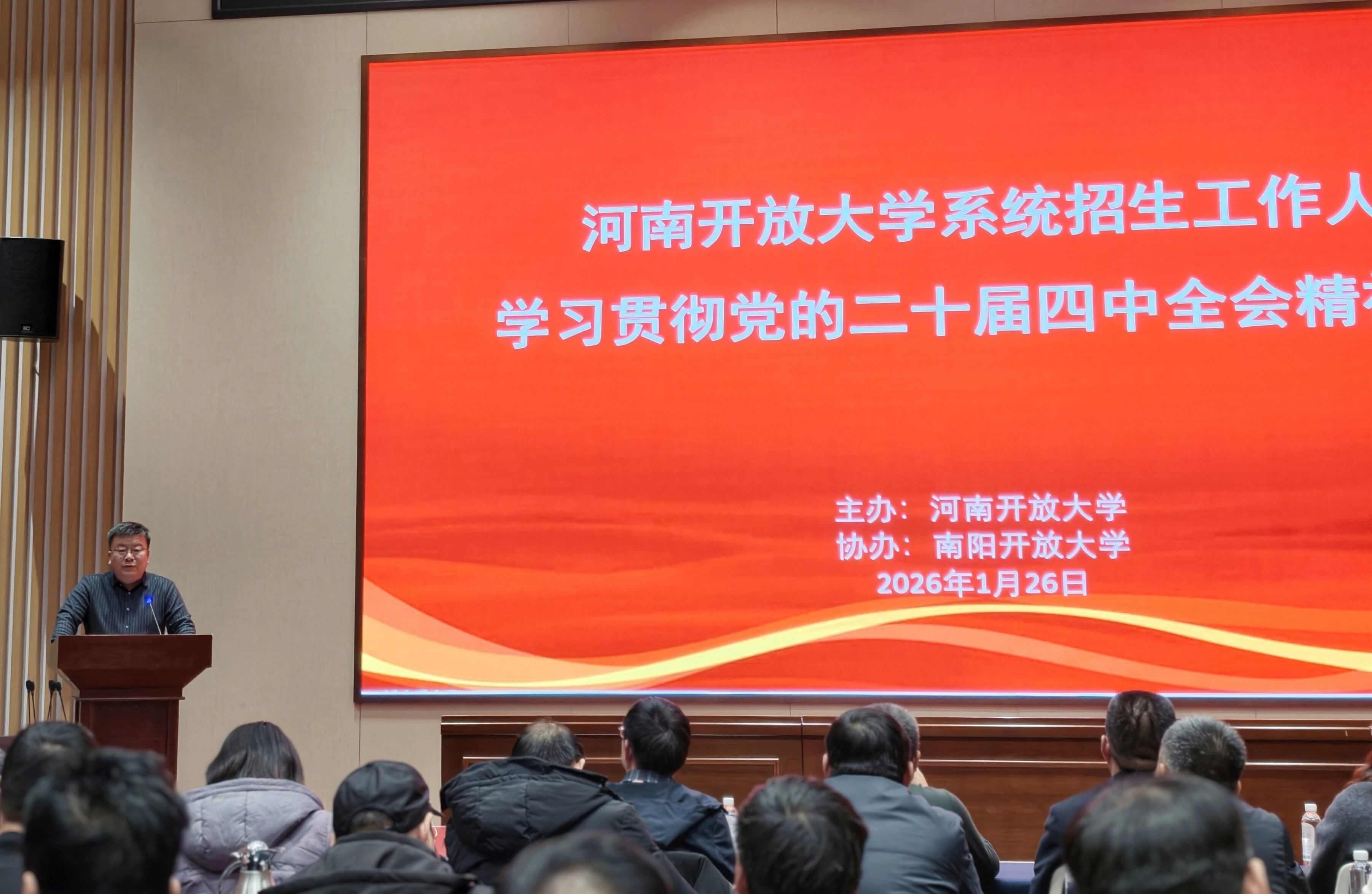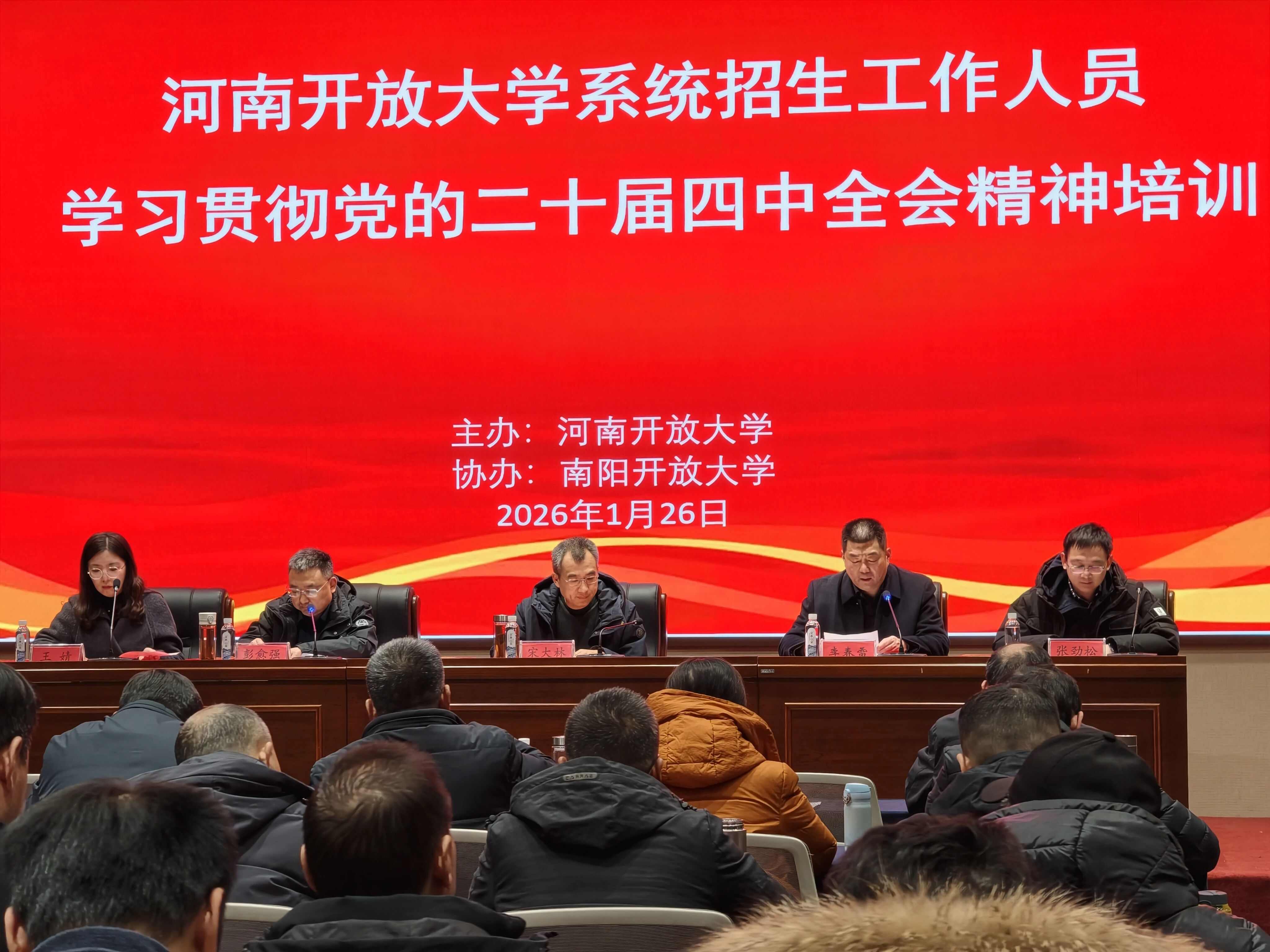 1月26日至27日,河南开放大学系统招生工作人员学习贯彻党的二十届四中全会精神培训在南阳顺利召开。此次会议是全省开放大学系统深入落实党的二十届四中全会精神的重要举措,是锚定河南开放大学“十五五”规划发展目标、推动开放教育招生工作提质增效的关键部署。河南开放大学副校长宋大林出席会议并讲话,系统建设处处长彭愈强主持会议。南阳开放大学党委书记、校长李春雷出席会议并致词,副校长陈同果代表先进集体作交流发言。全省28所市(县)级分校、学院领导及招生负责人共80余人齐聚一堂,共商招生改革大计,共谋开放教育发展新篇。